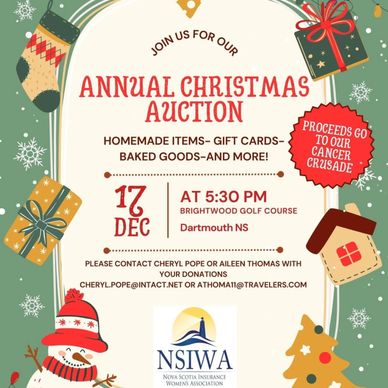 Our Annual NSIWA Christmas Dinner and Auction is taking place on December 17, 2025 at the Brightwood Golf Course. Members are encouraged to bring items for the auction as well as guests. This is one of our most popular events of the year! Proceeds go to our Cancer Crusade.